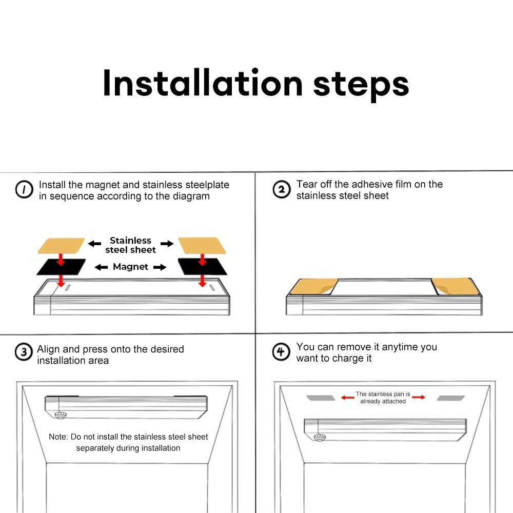 With built-in strong magnets, these motion light indoor are easy to install, no need for an electrician. It can be adsorbed directly on ironwork surfaces. Or use the included adhesive metal plates to stick on anywhere you want. That also means it’s easy to take off and put back on when it needs a charge.